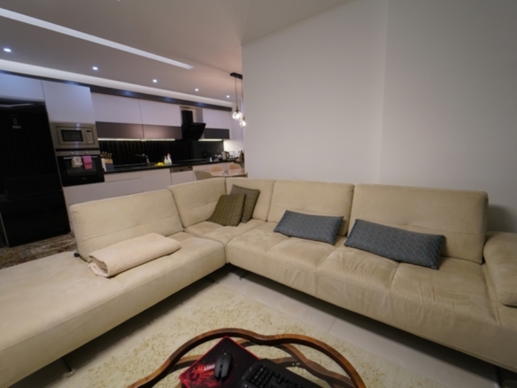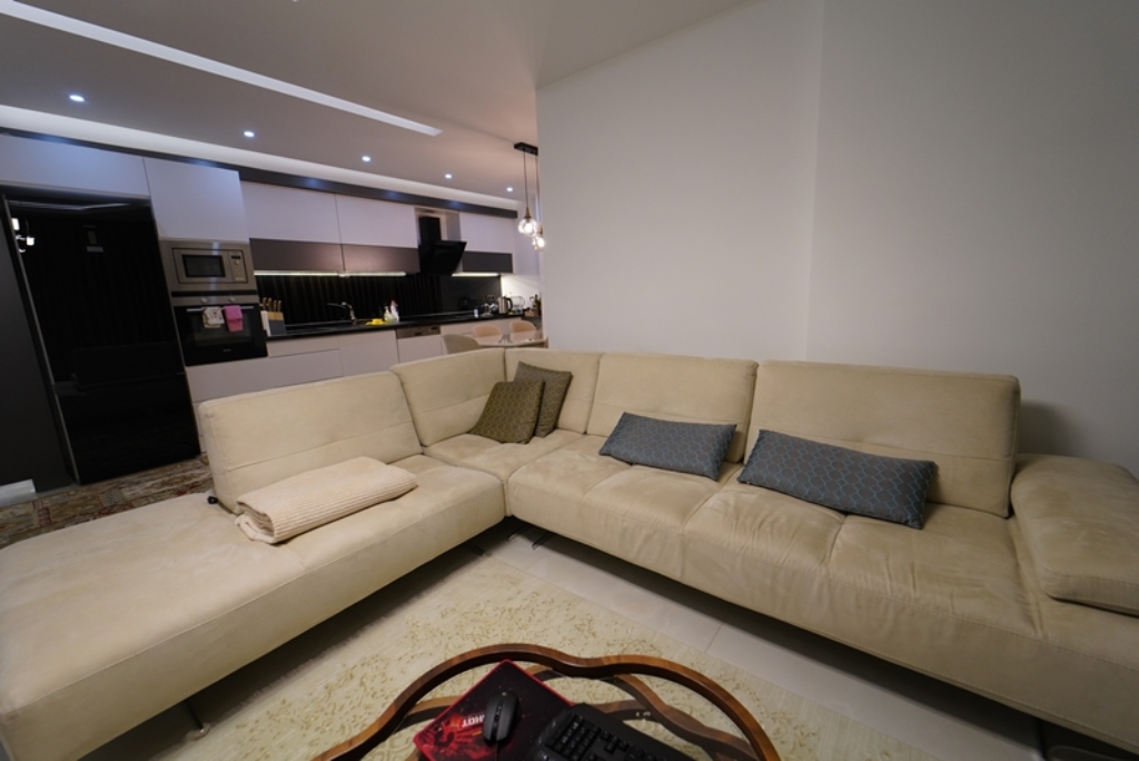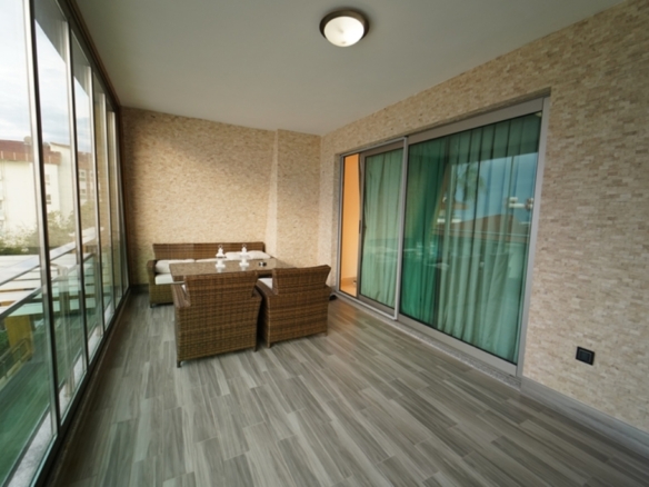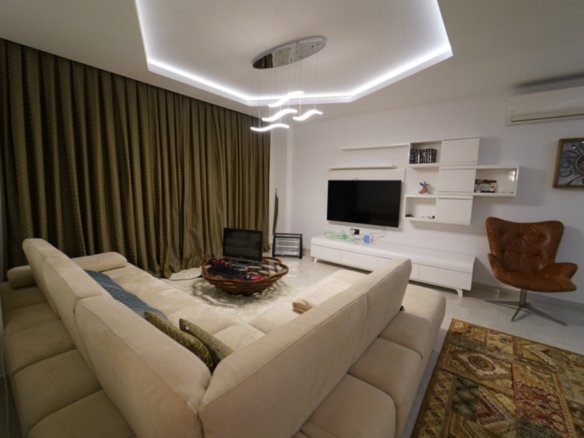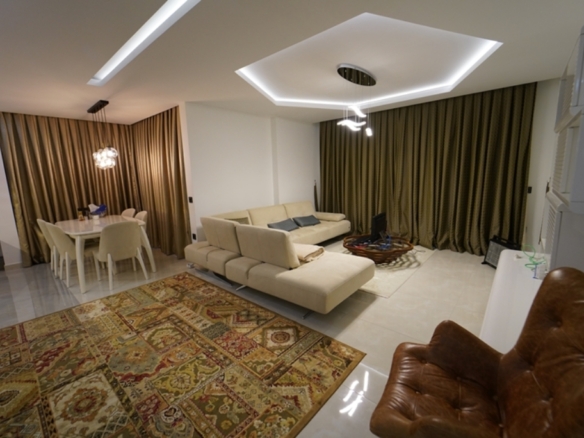 On the second floor of one of these blocks lies a fully furnished 2+1 apartment, offering 125 square meters of refined living space. From the moment you walk in, the home feels open and inviting, with sunlight flowing in from three directions — south, north, and west — filling every corner with warmth throughout the day.