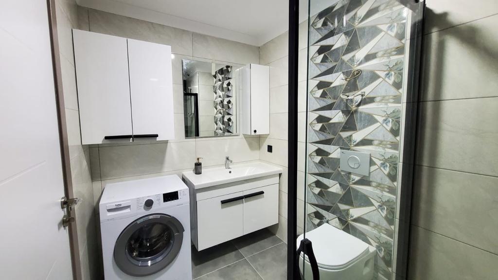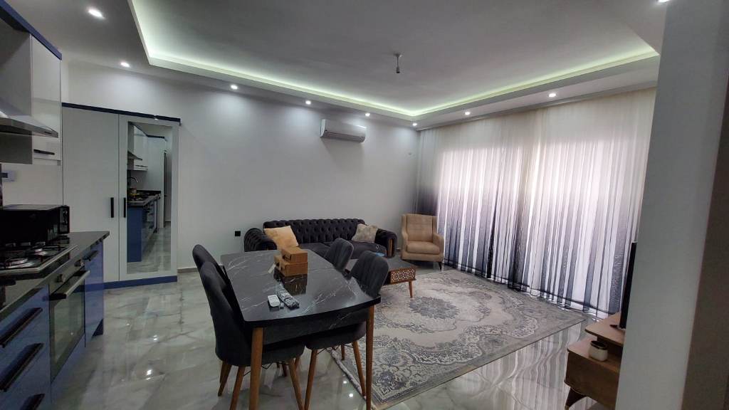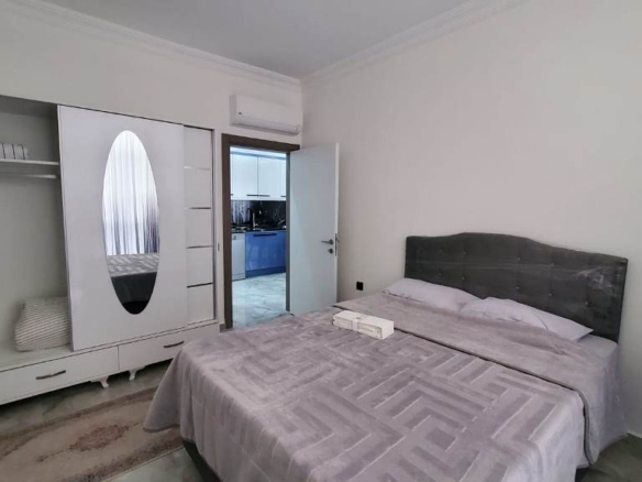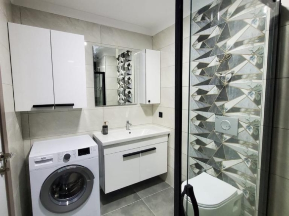 Situated on the 5th floor of a newly built 9-story building (2023), this stylish 1+1 apartment welcomes you with a bright and airy atmosphere. Spanning 55 m², the space is thoughtfully designed to maximize comfort and functionality. The open-plan American kitchen flows naturally into the living area, creating a cozy yet modern environment ideal for relaxing or entertaining.